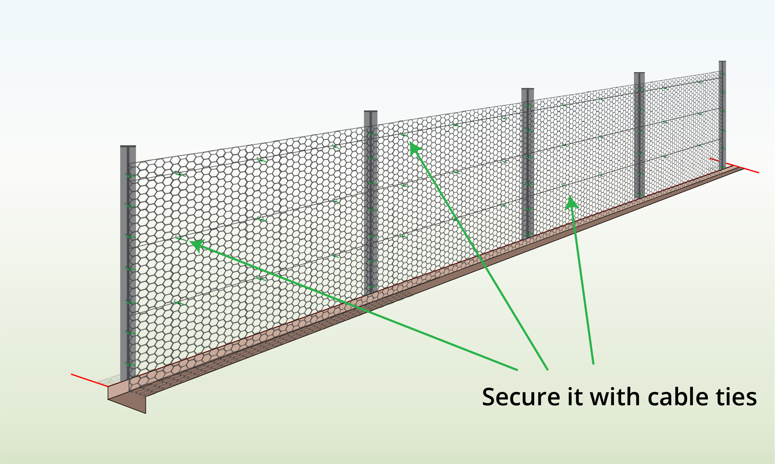 In case you’ve installed a tension wire, use cable ties to secure the mesh to it, leaving about 30-45 cm between each tie. |