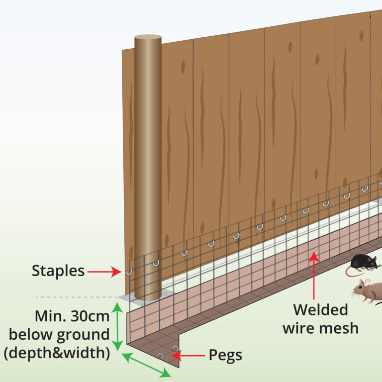 Use staples spaced no more than 15cm apart and hammer them into the bottom of the fence. Secure the mesh to the ground with pegs. Ensure the mesh is taut and free from wrinkles or folds. |