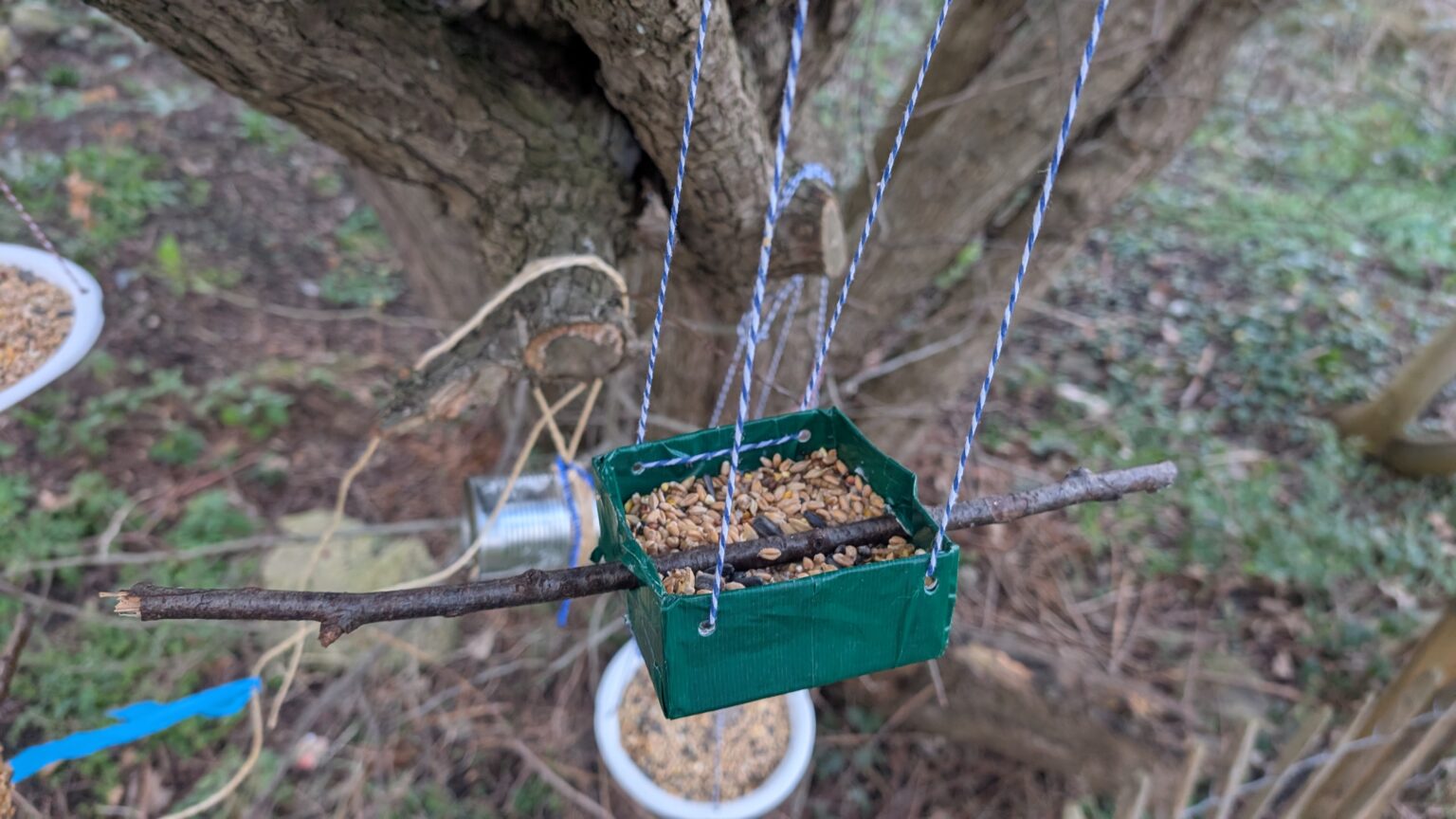 My thoughts: The benefit of using duct tape is that it is waterproof and should last longer outdoors. The rest of the materials used in the tutorial can be easily substituted. For example, you can use virtually any food container as long as you cut it shallow enough for birds to dip into. I didn’t have any wooden skewers in the kitchen, so I just used sticks from the garden, which worked out fine. One tip worth noting is that you need a good-quality hole punch. Mine was basic and didn’t fit over the multiple layers of duct tape.