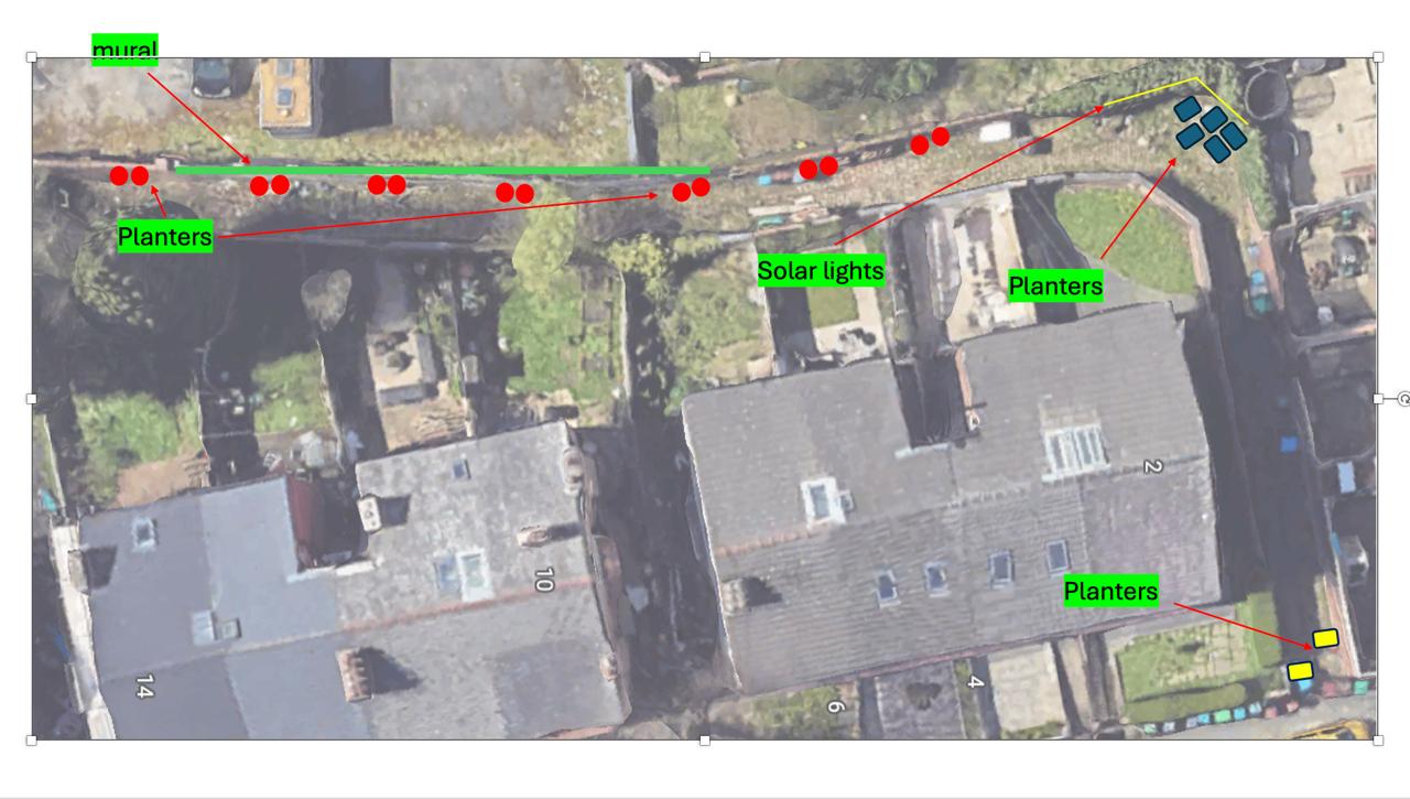 - Mural along the grey breeze block wall as a centre piece, which will hopefully make the alley more welcoming