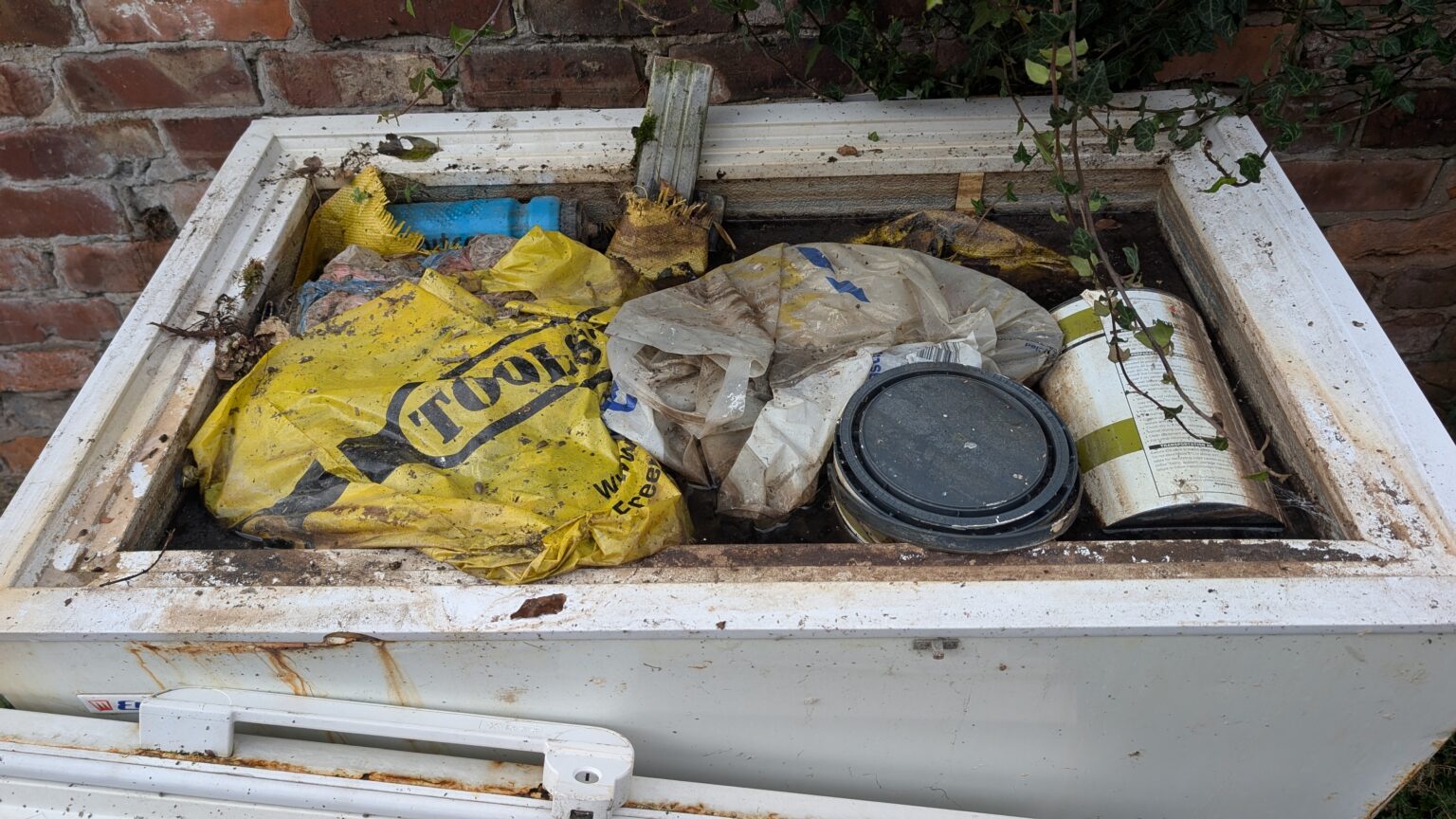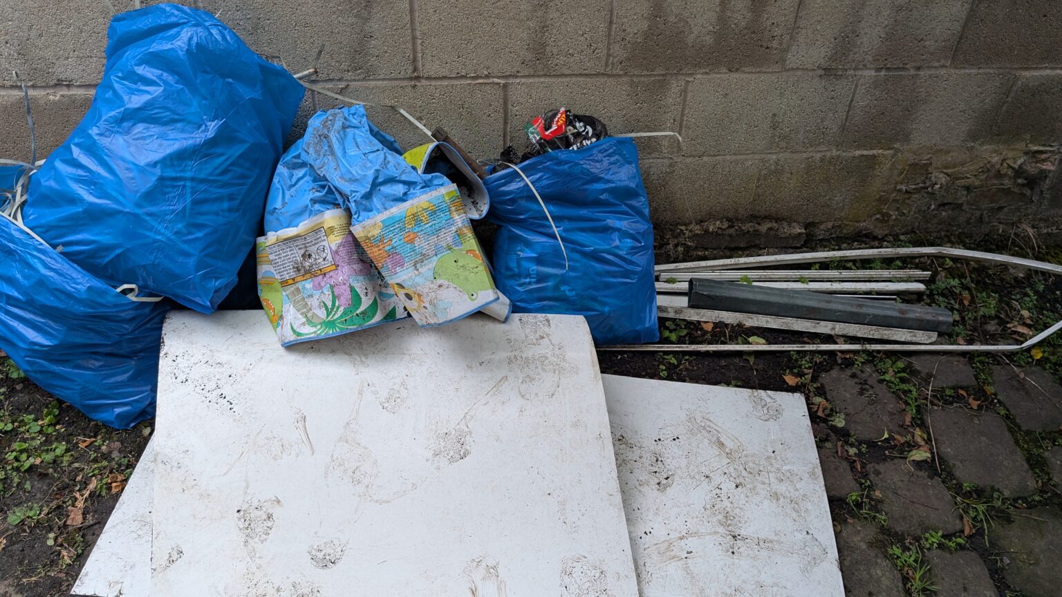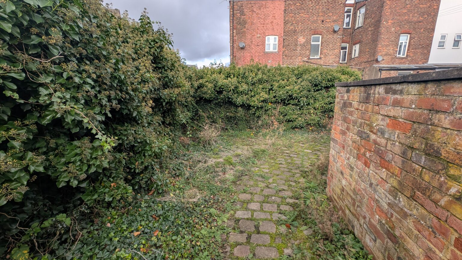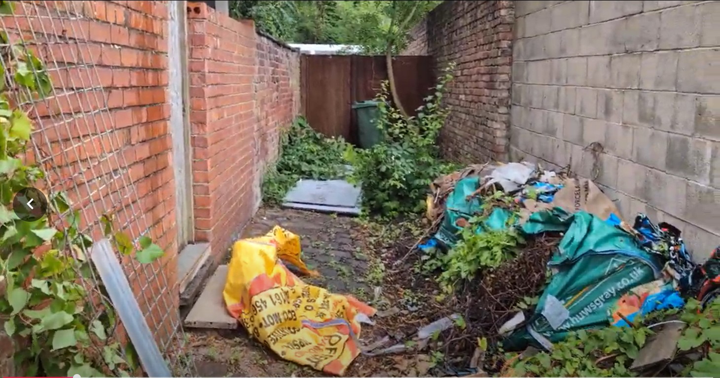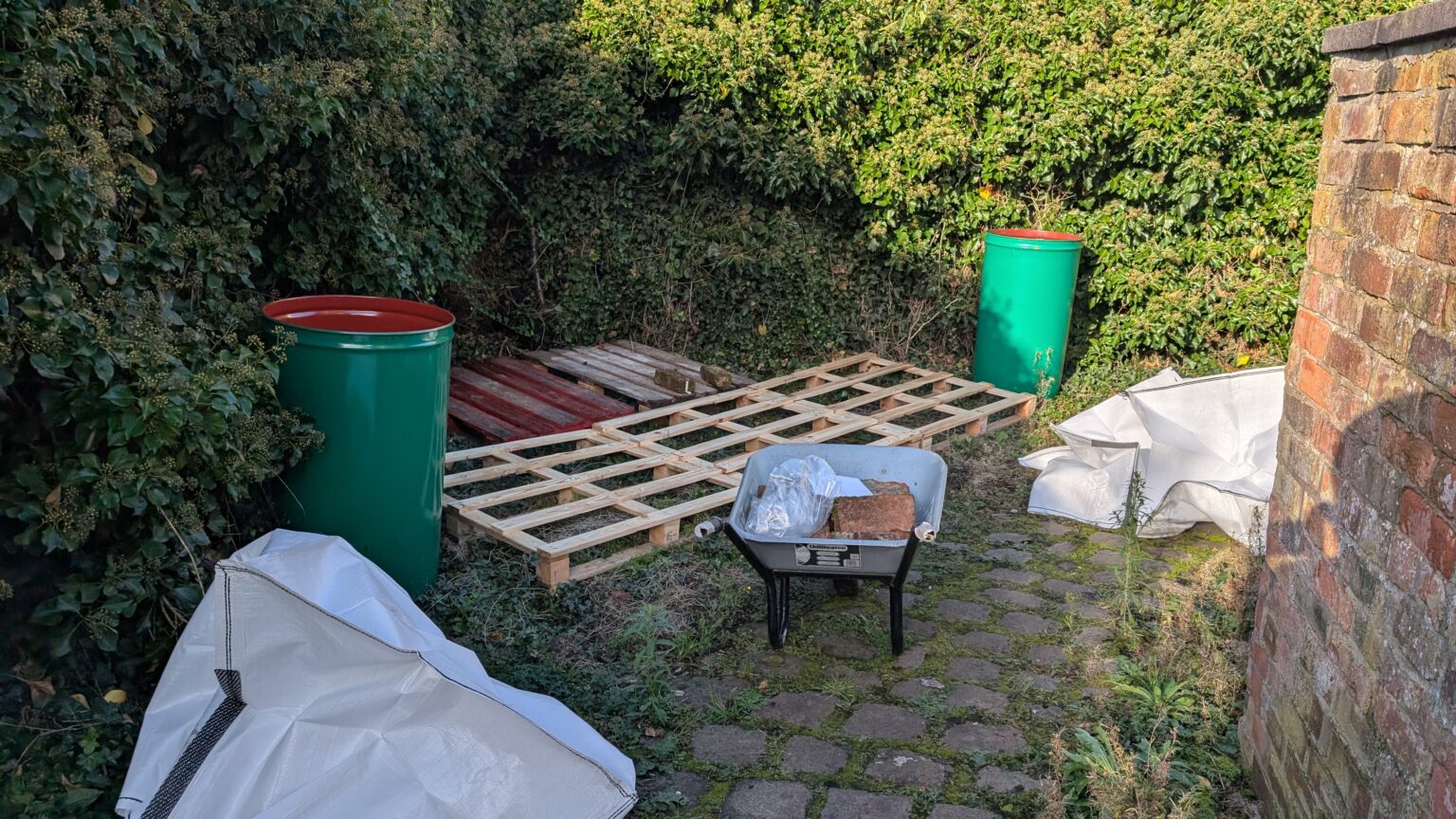 At the far end of the alley, we planned to create an allotment area, material and budget permitting. It was full of old building material, paddling pools, overgrowth, a discarded green bin and a buried pet.