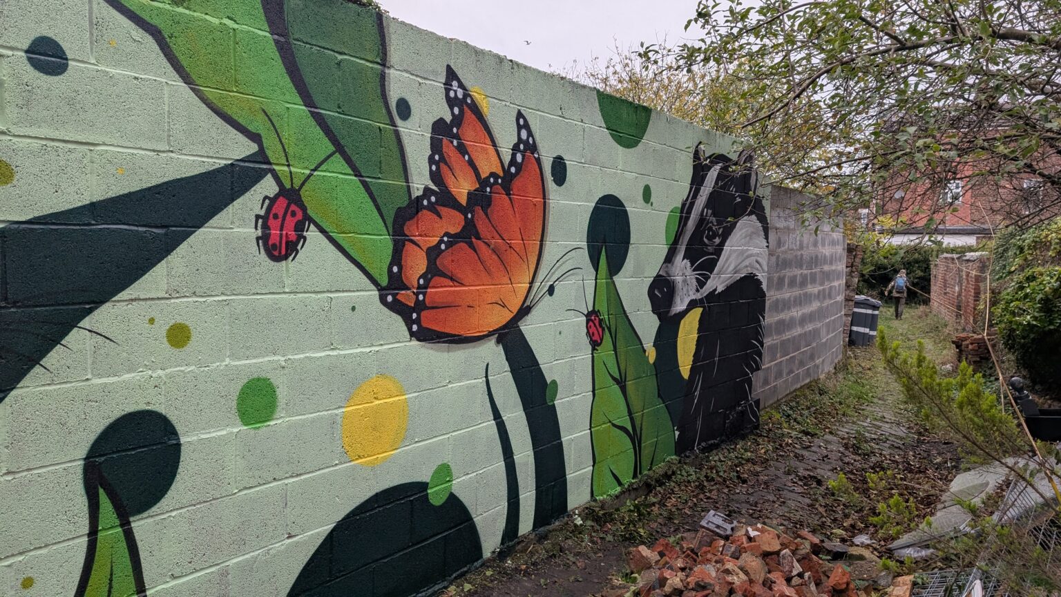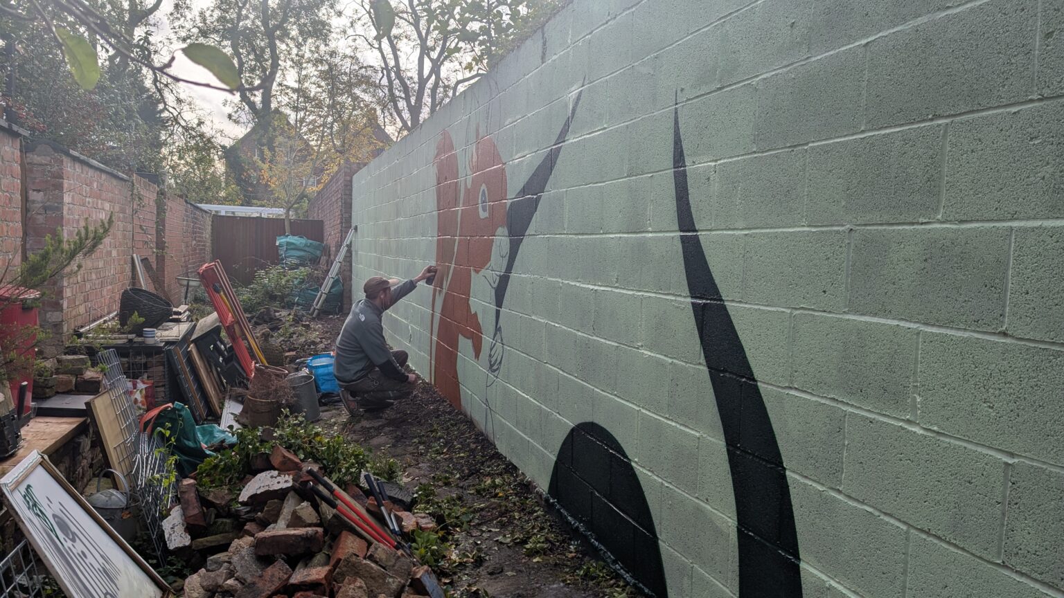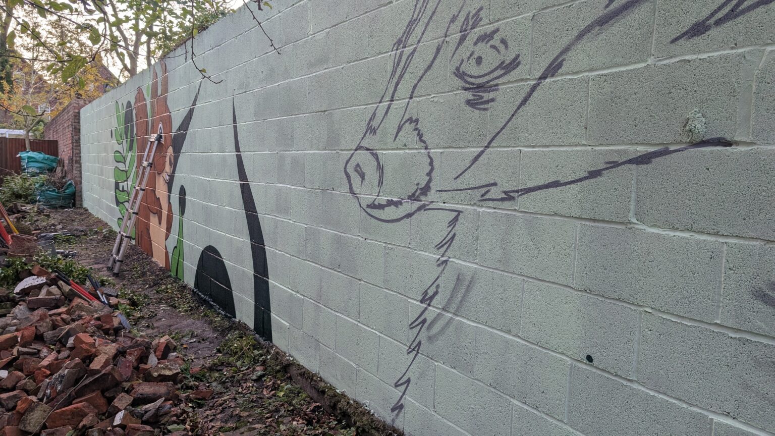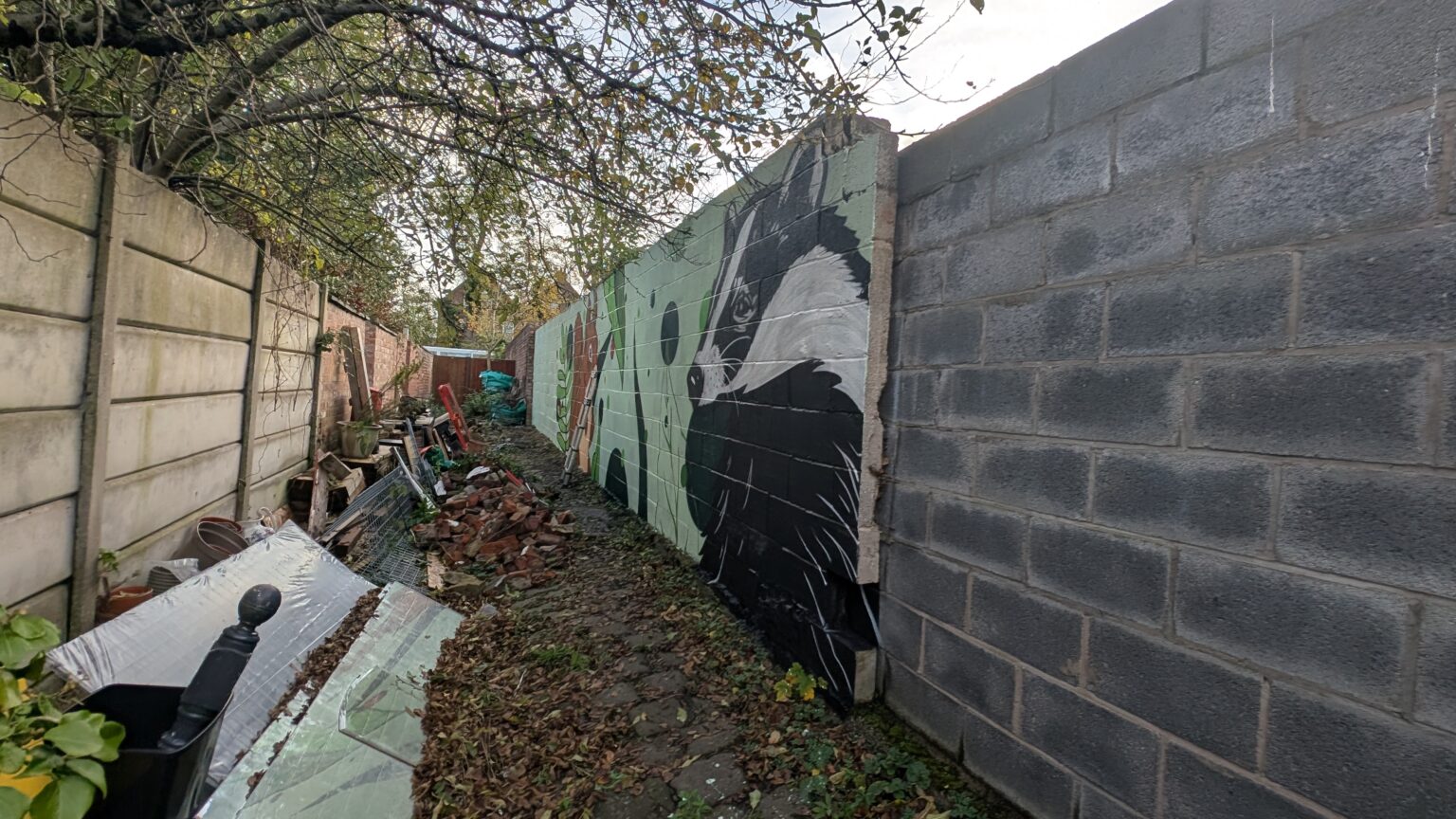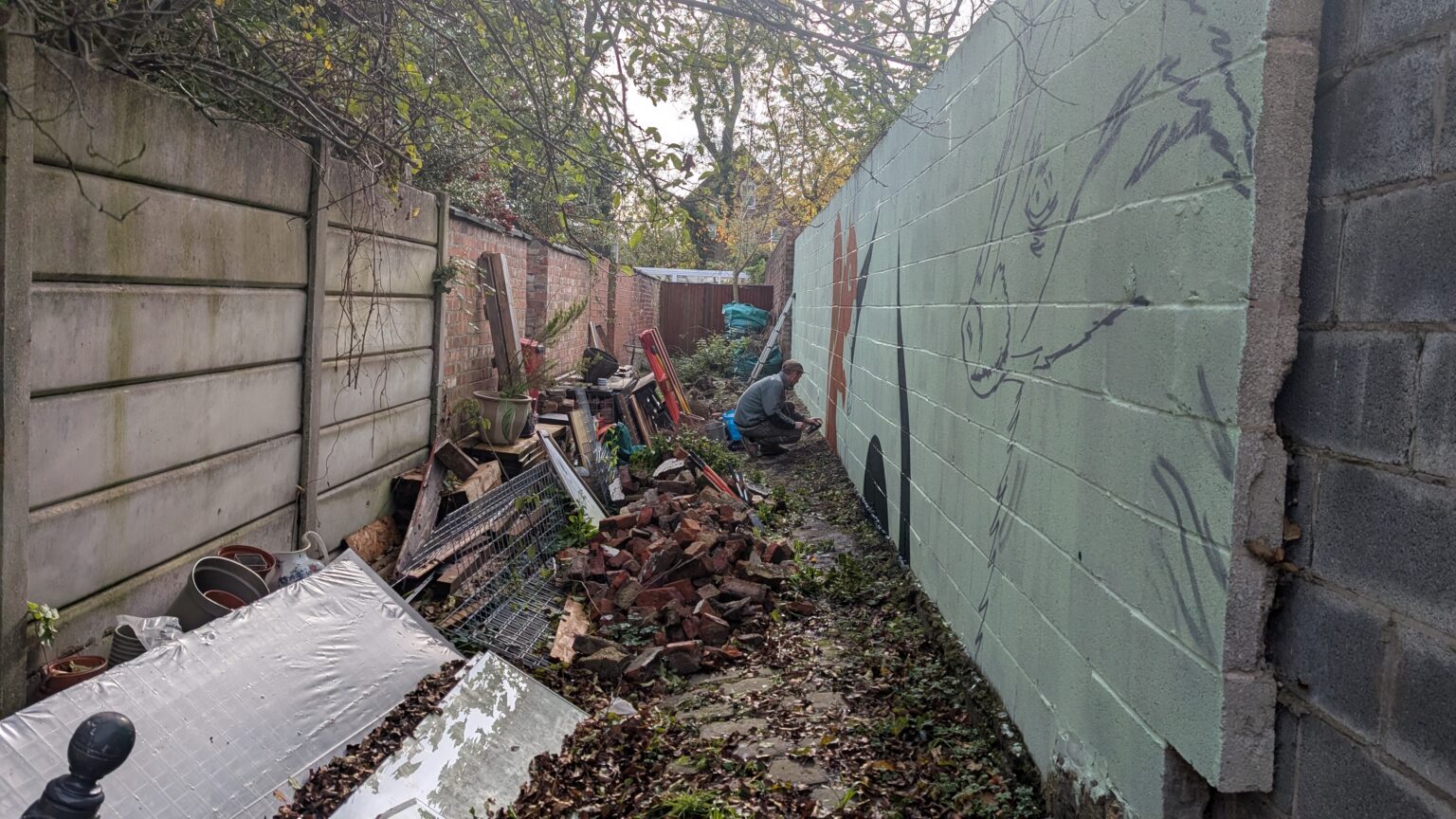 In July 2025, during a dinner with our neighbours, we decided to tidy up the alleyway. We thought a good place to start would be to paint the 10m-long breezeblock wall. We thought that it would make the alleyway look cared for, which would deter fly-tippers. So we got in touch with a local artist Richard @ Heart Murals, who agreed to paint a mural on the wall.