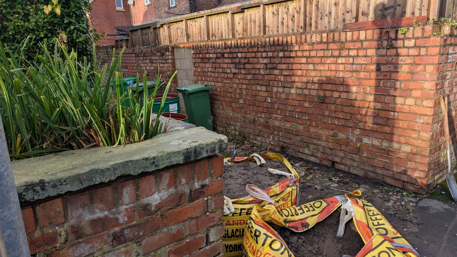 At the far end of the alley, we planned to create an allotment area, material and budget permitting. It was full of old building rubble, paddling pools, overgrowth, a discarded green bin and a buried pet.