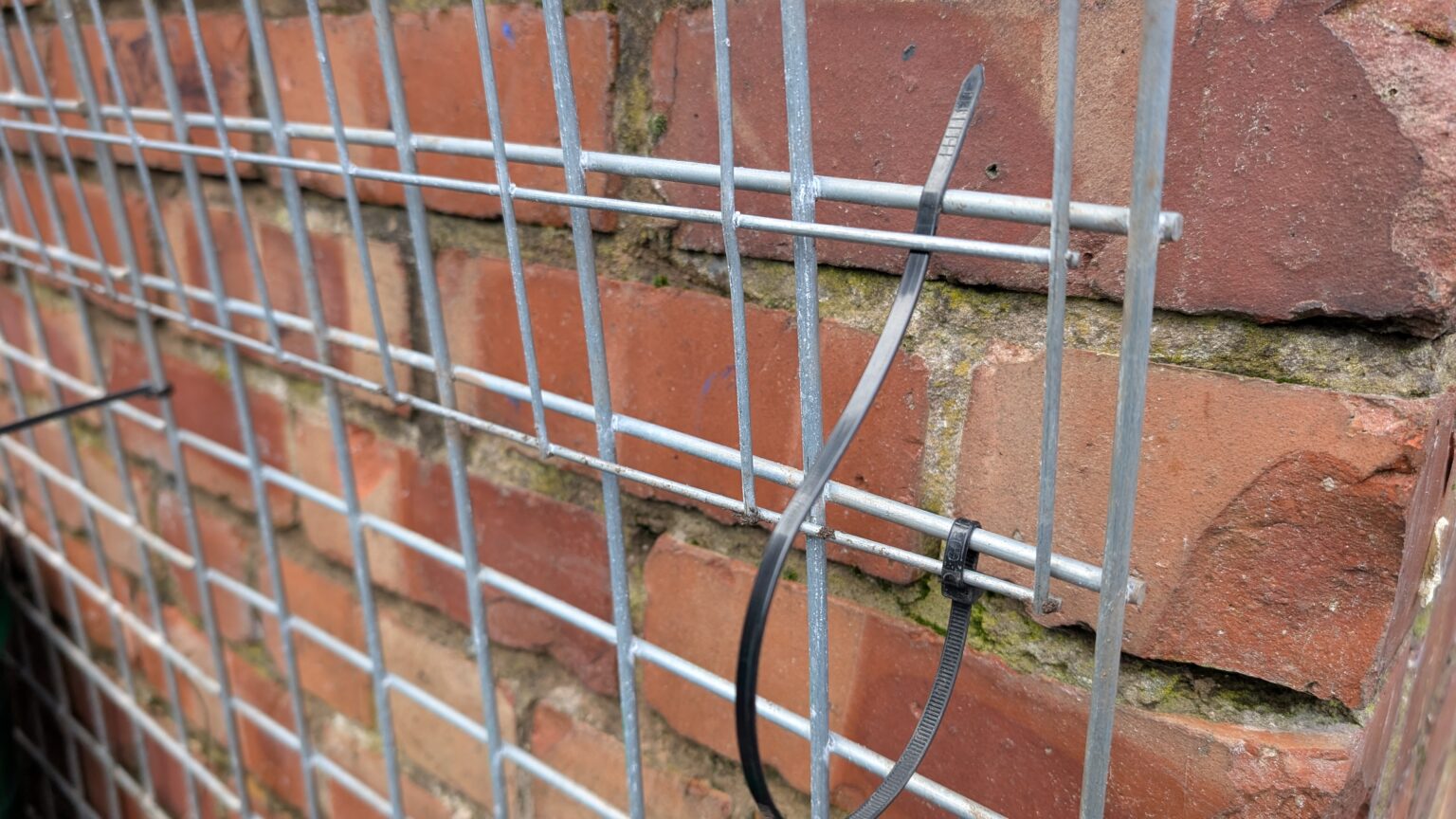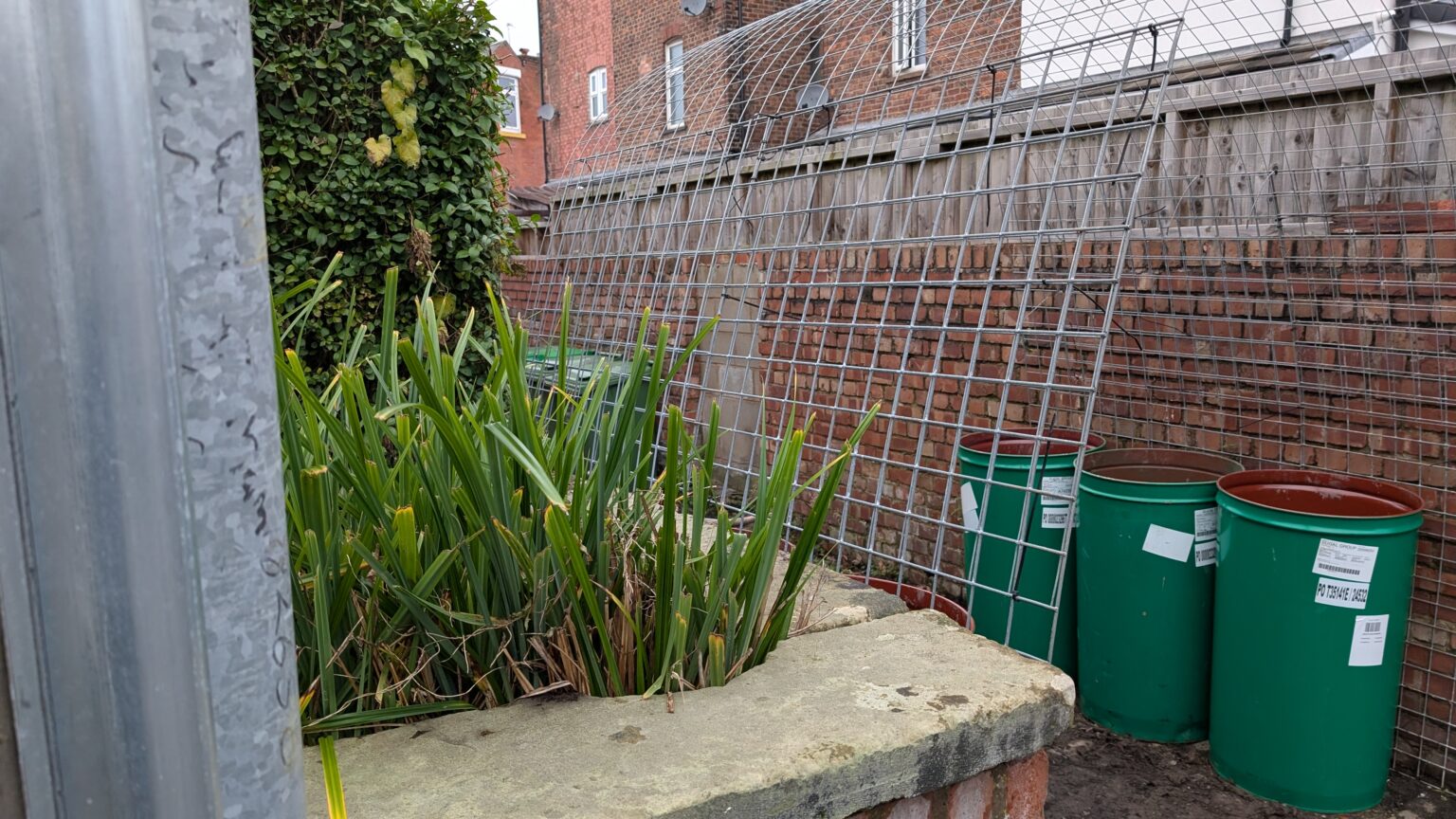 We wanted to create an archway feature at the entrance to show that the alleyway is well-maintained and deter fly-tippers. We used tomato drums as planters (£15 each from Marketplace), 4x 2m x2m panels (donated by Wire Fence) and cable ties. The planters were filled with the remainder of the soil and bricks from the alleyway.