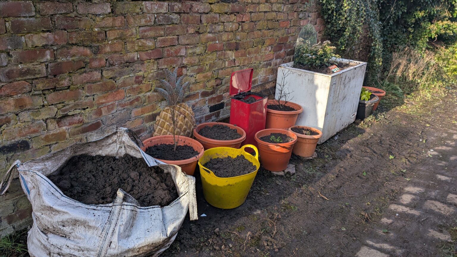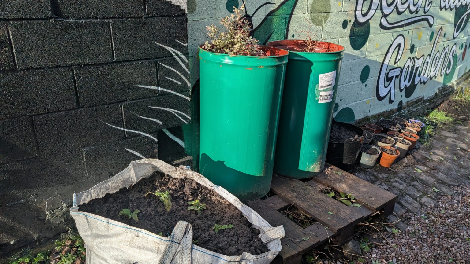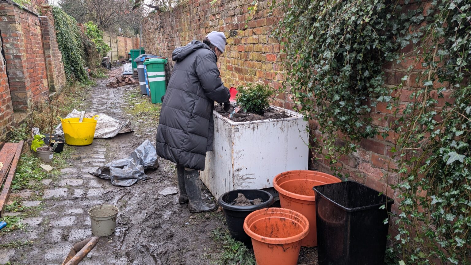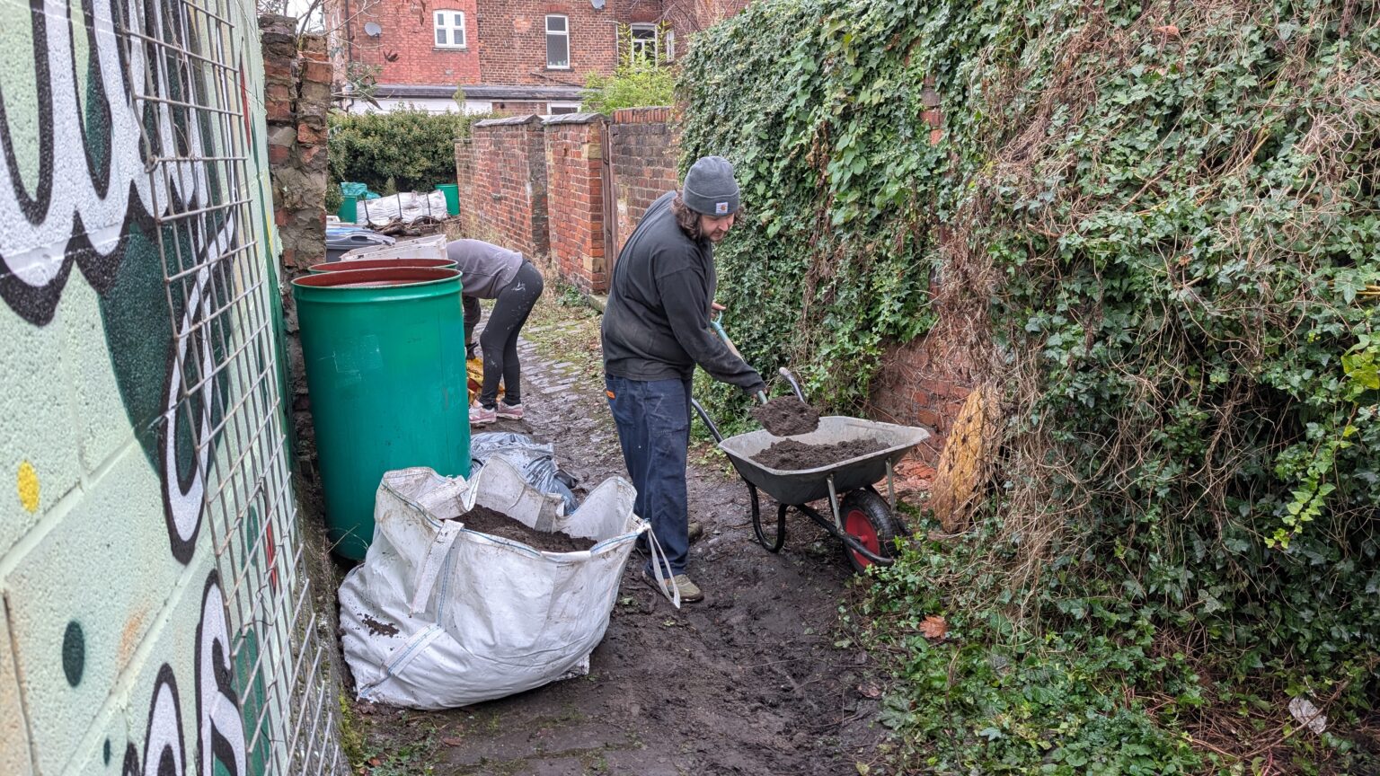 The neighbours helped to take the soil from the alleyway entrance to the planters and pots that needed filling