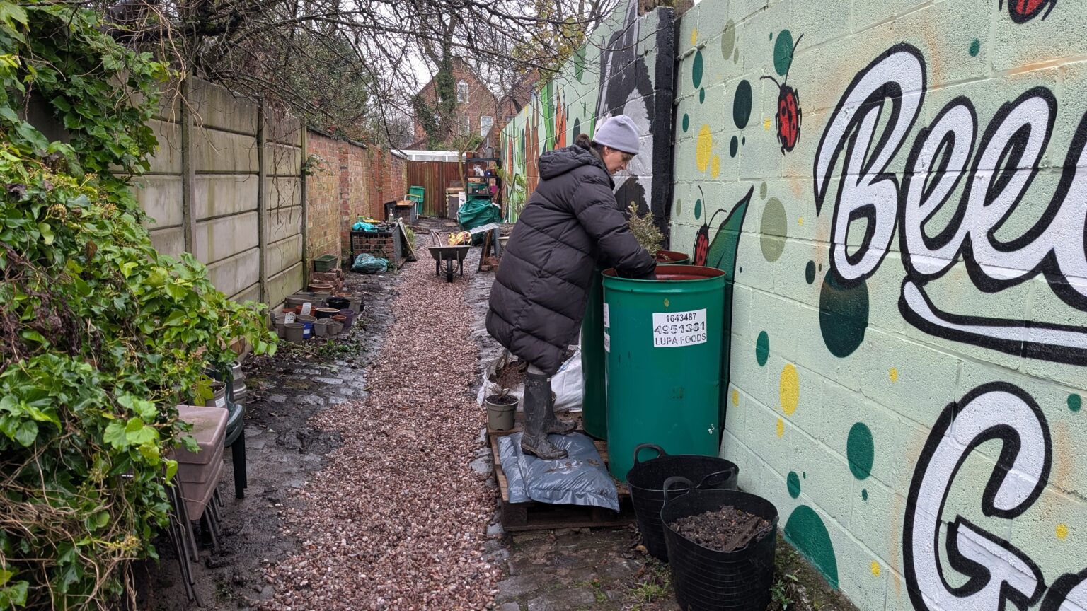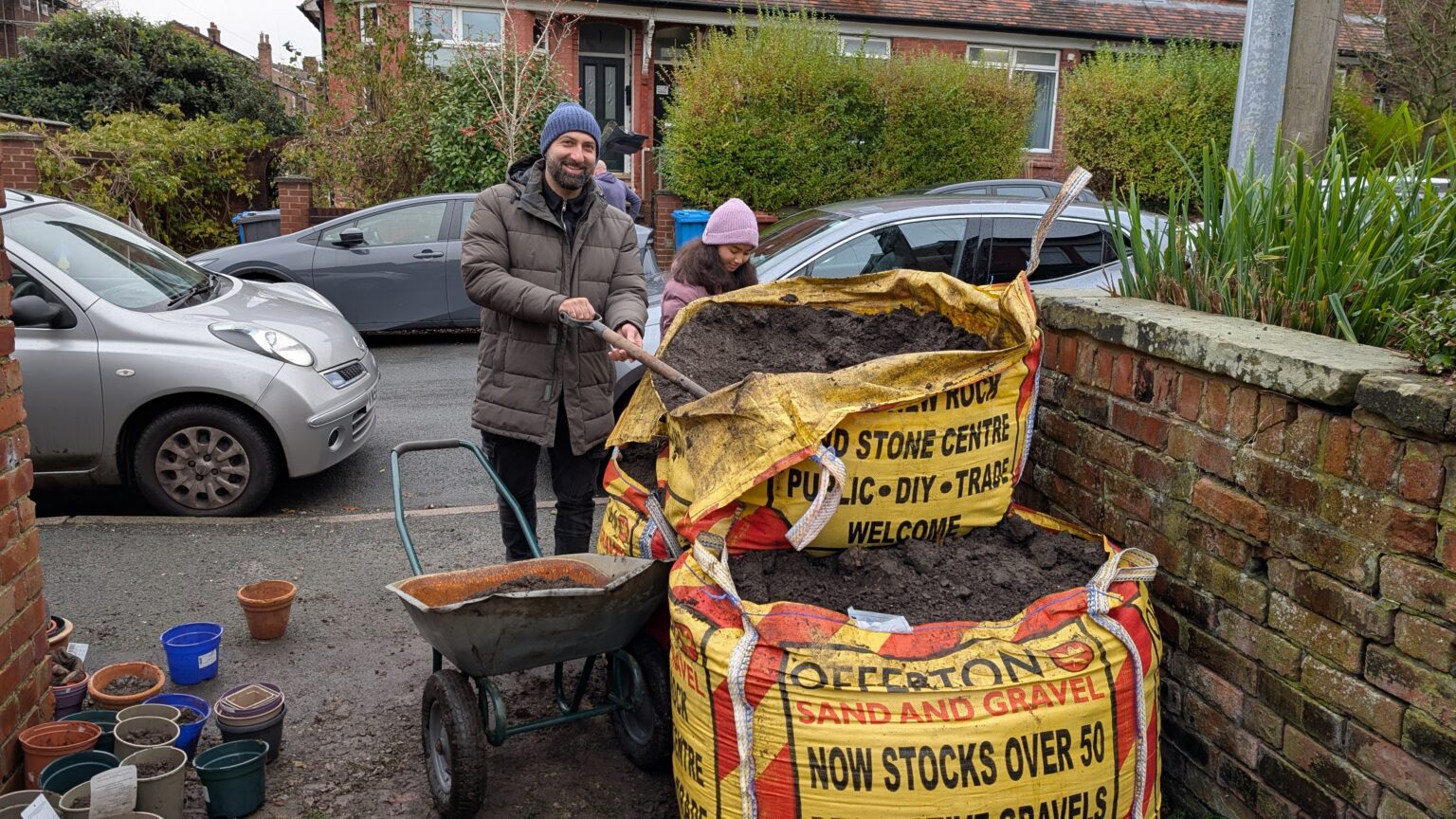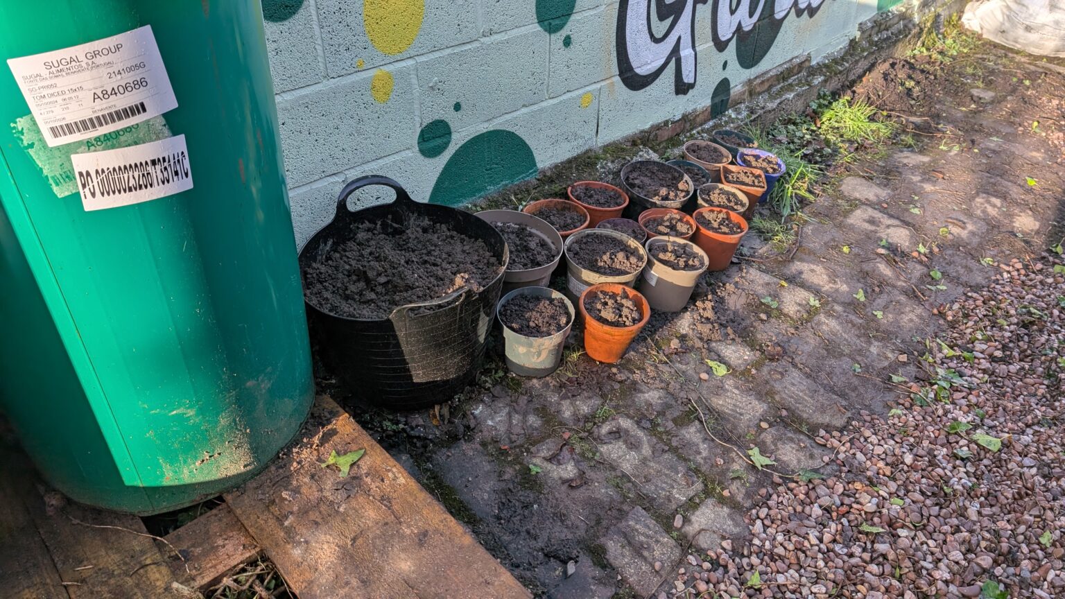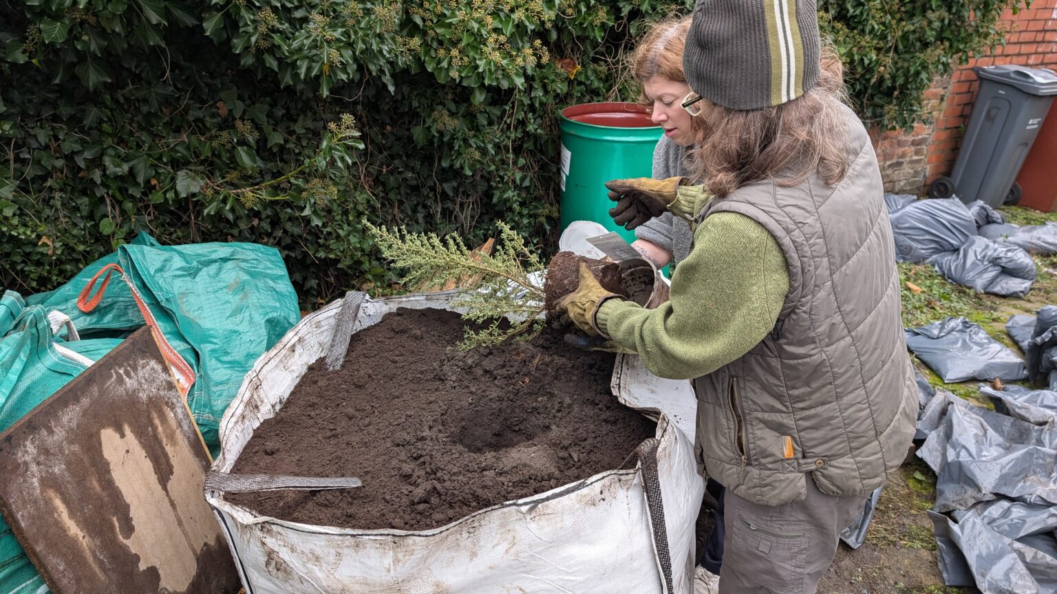 The neighbours helped to take the soil from the alleyway entrance to the planters and pots that needed filling