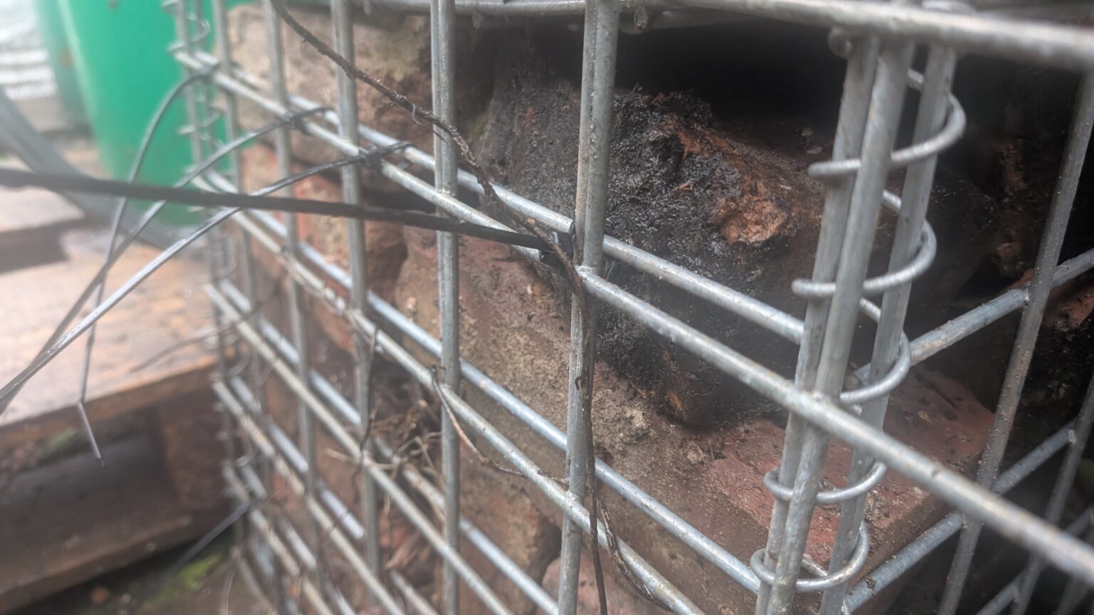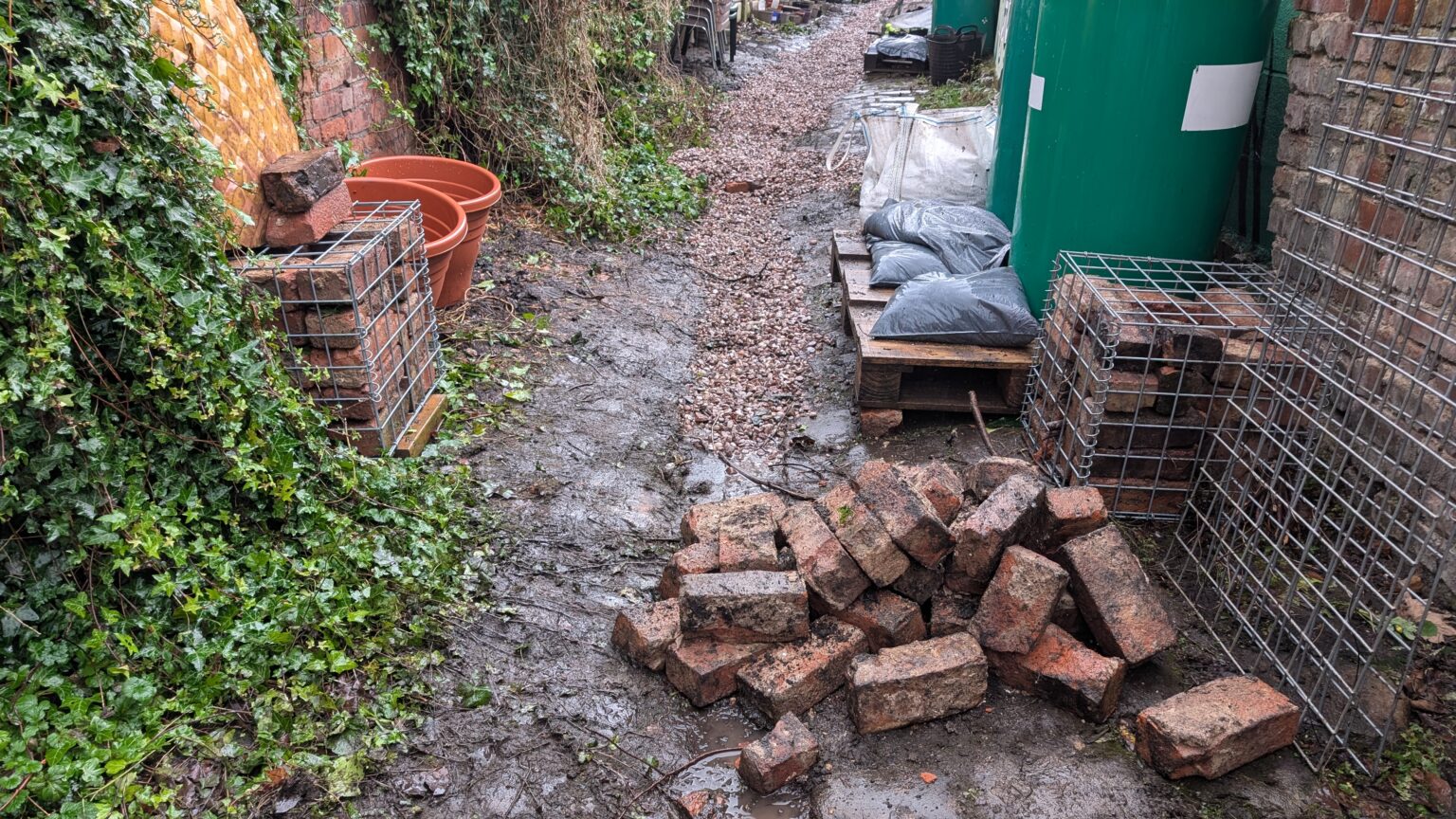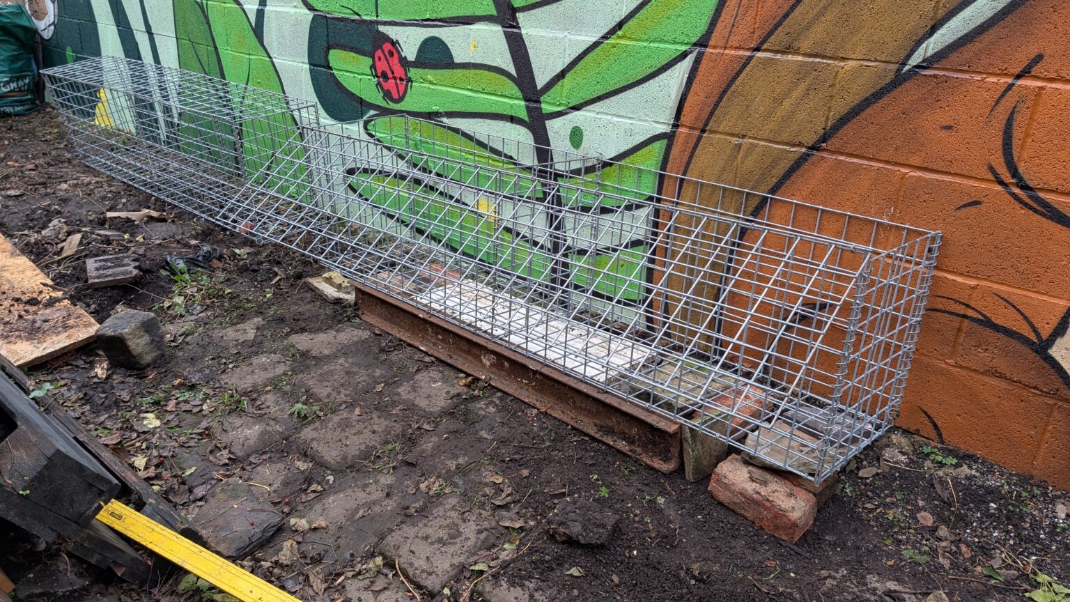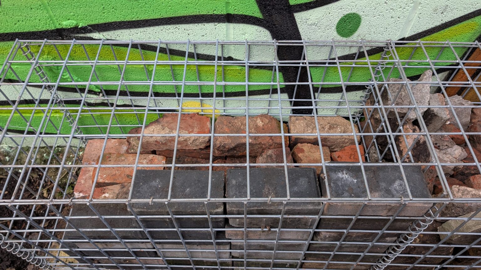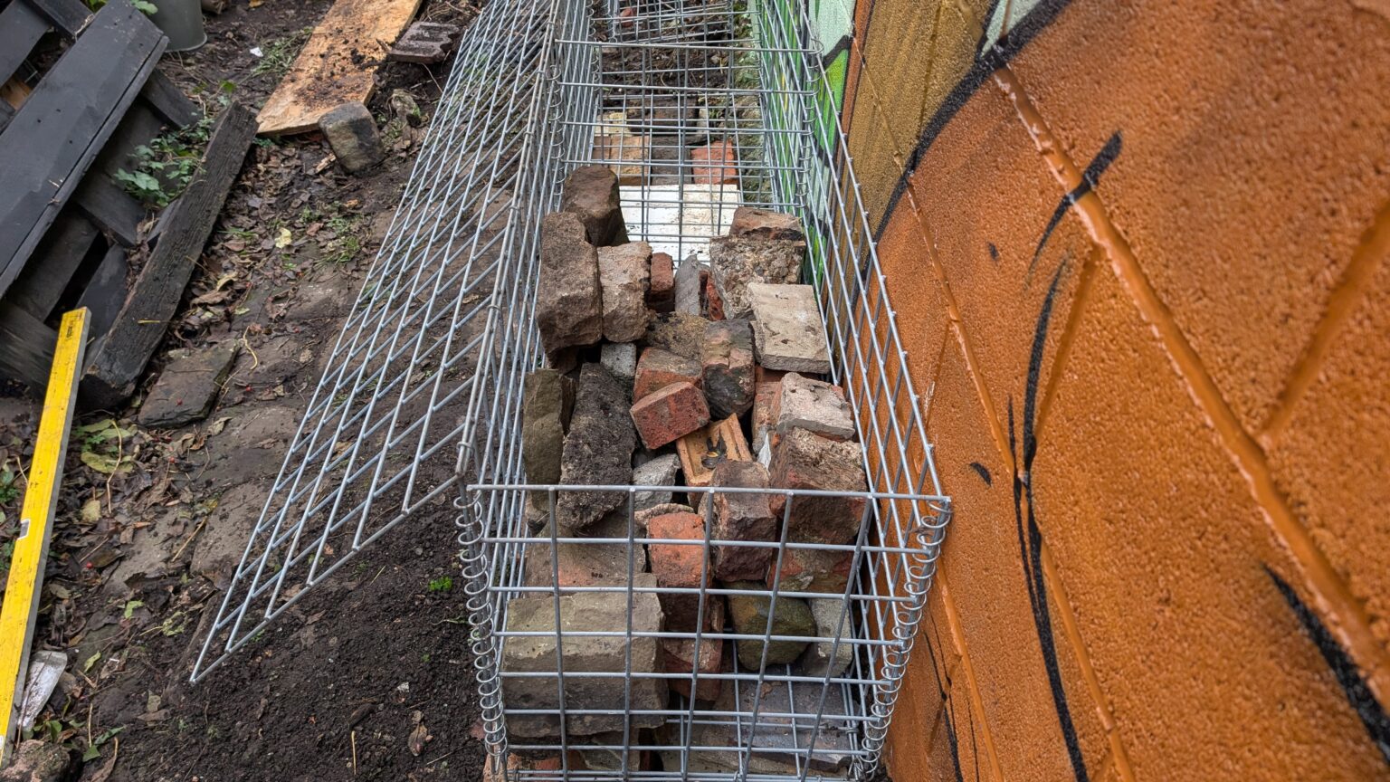 We placed x2 45cm cube gabions on either side of the alley, then filled them with bricks to weigh them down