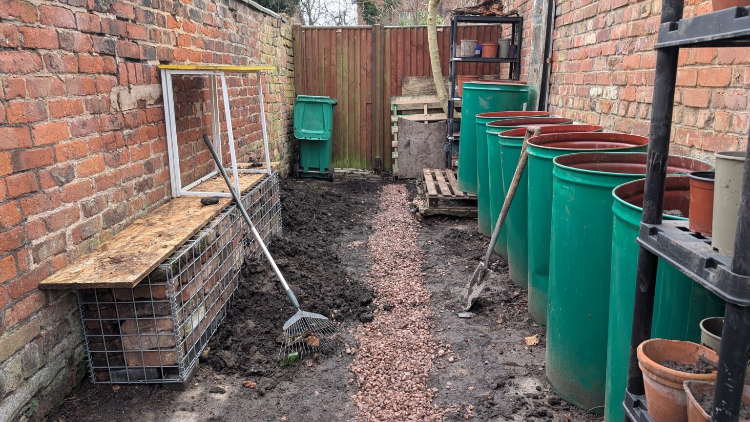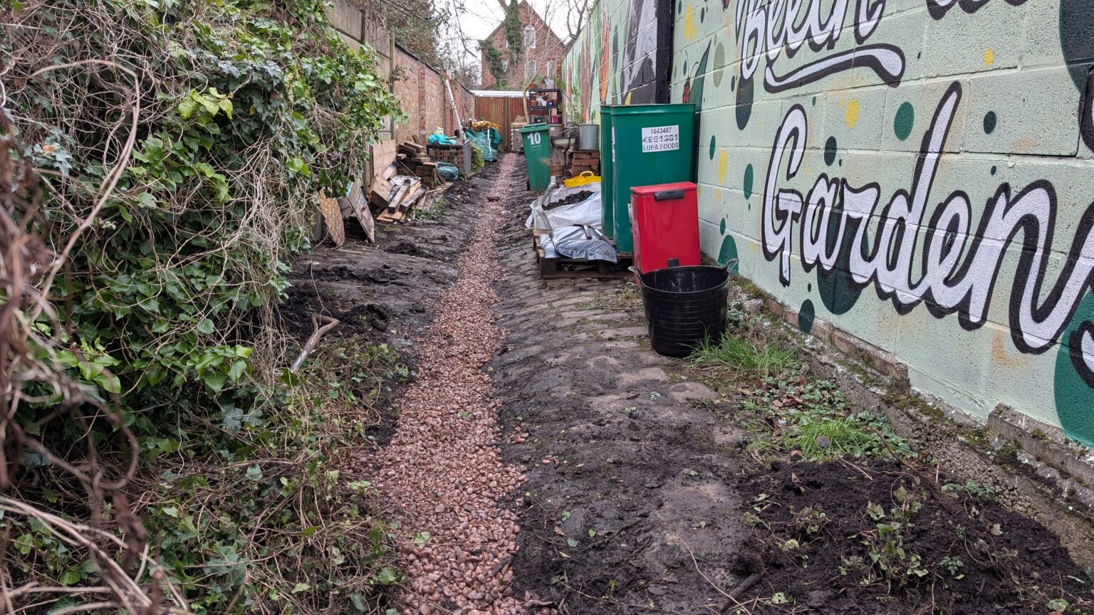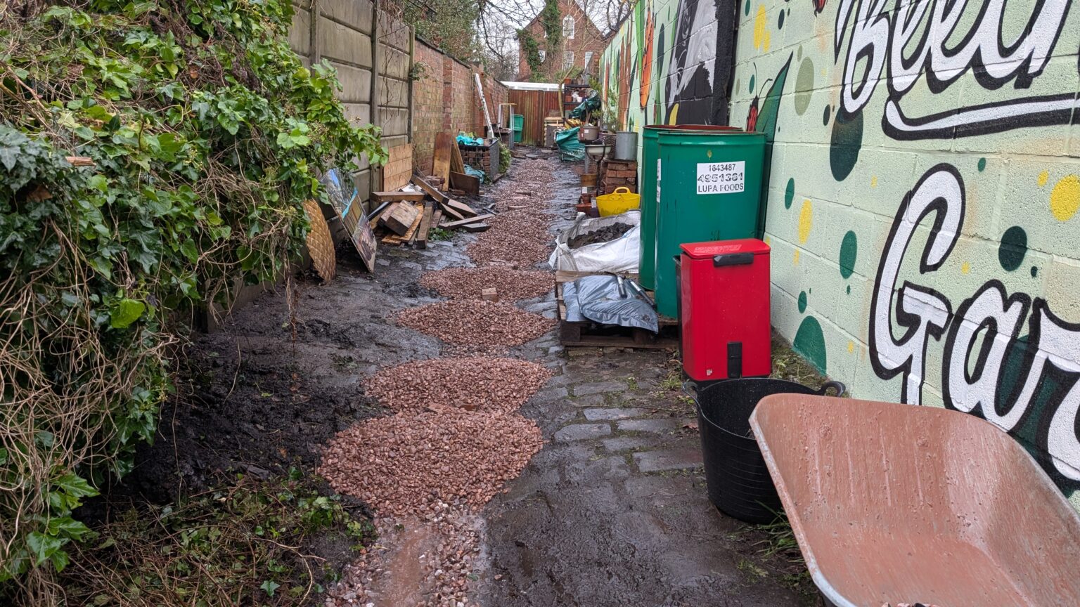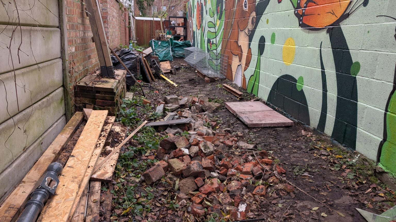 At the far end of the alley, we planned to create an allotment area, material and budget permitting. It was full of old building rubble, paddling pools, overgrowth, a discarded green bin and a buried pet.