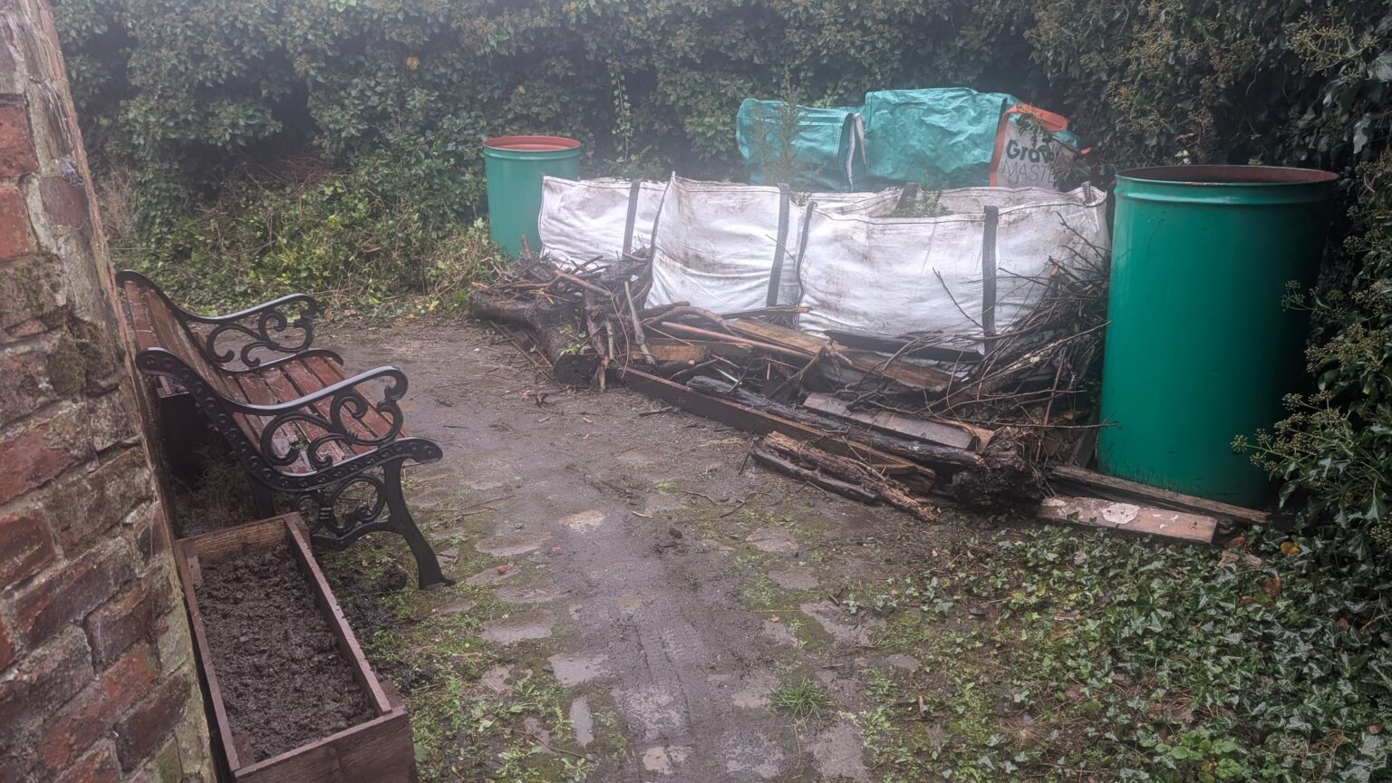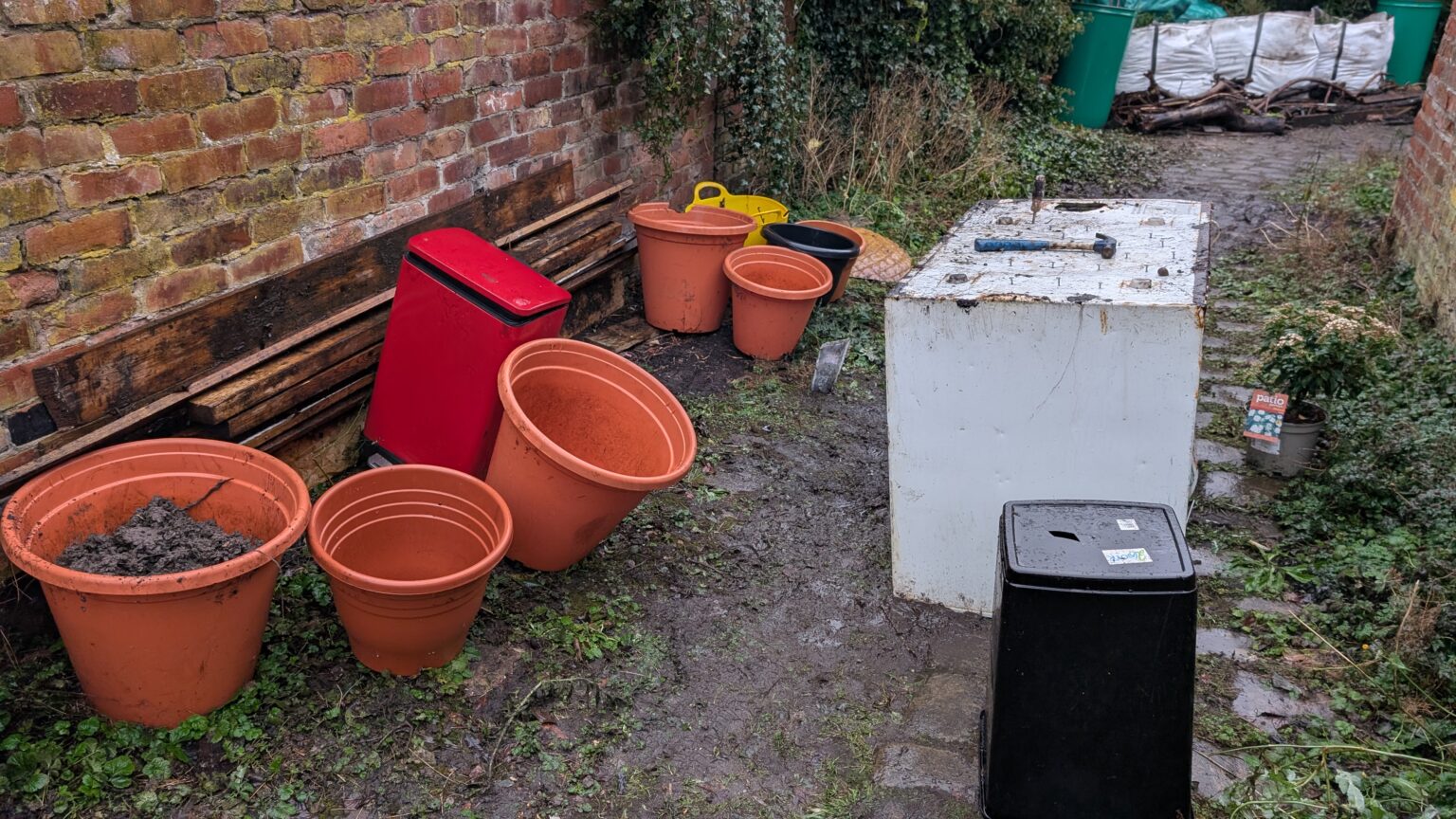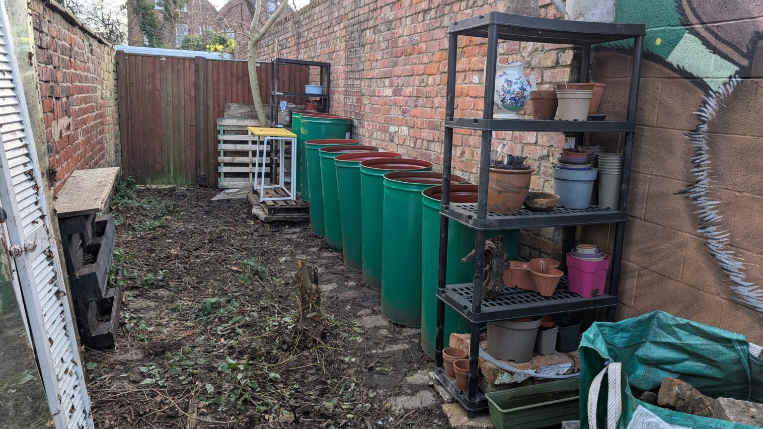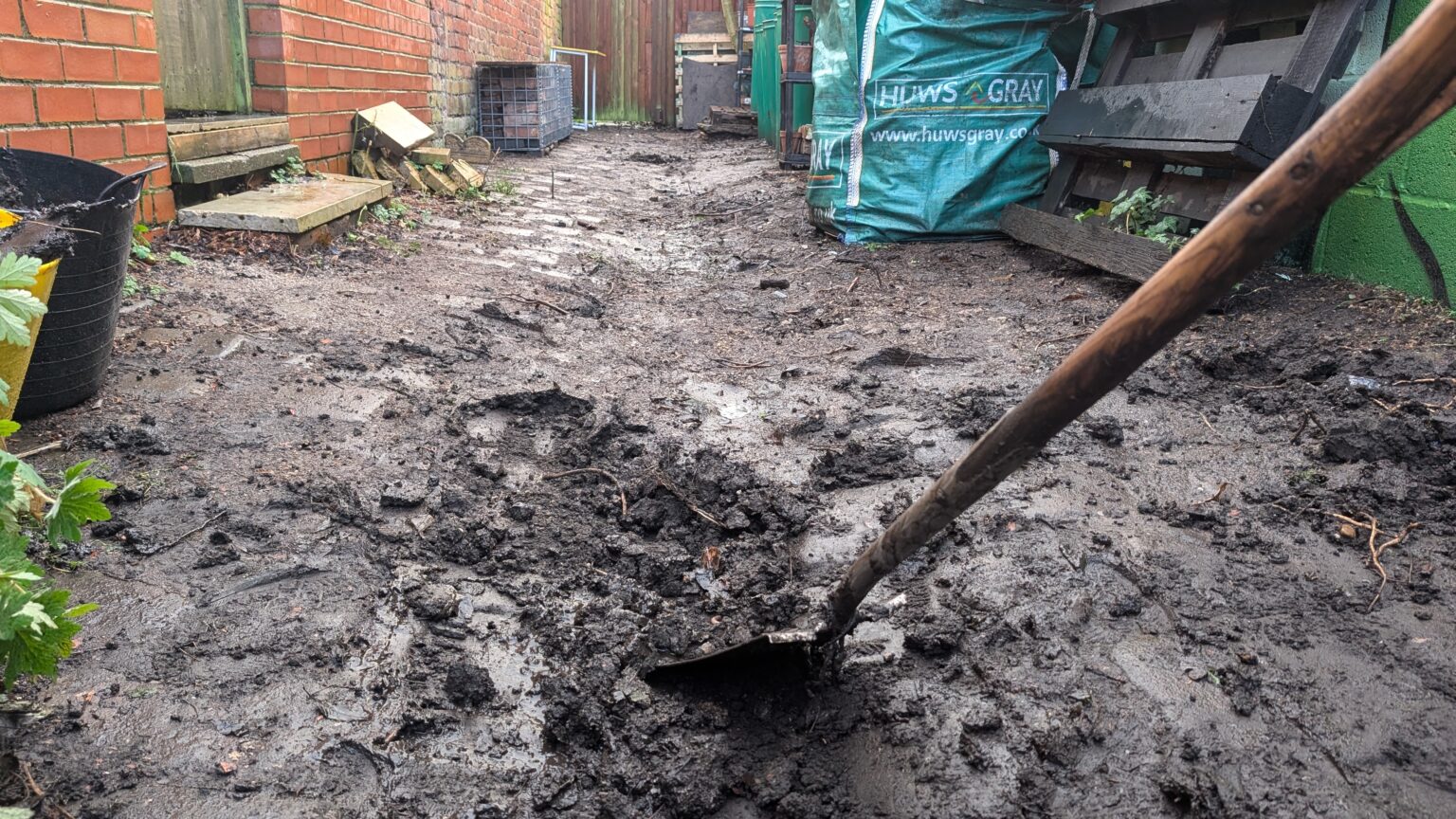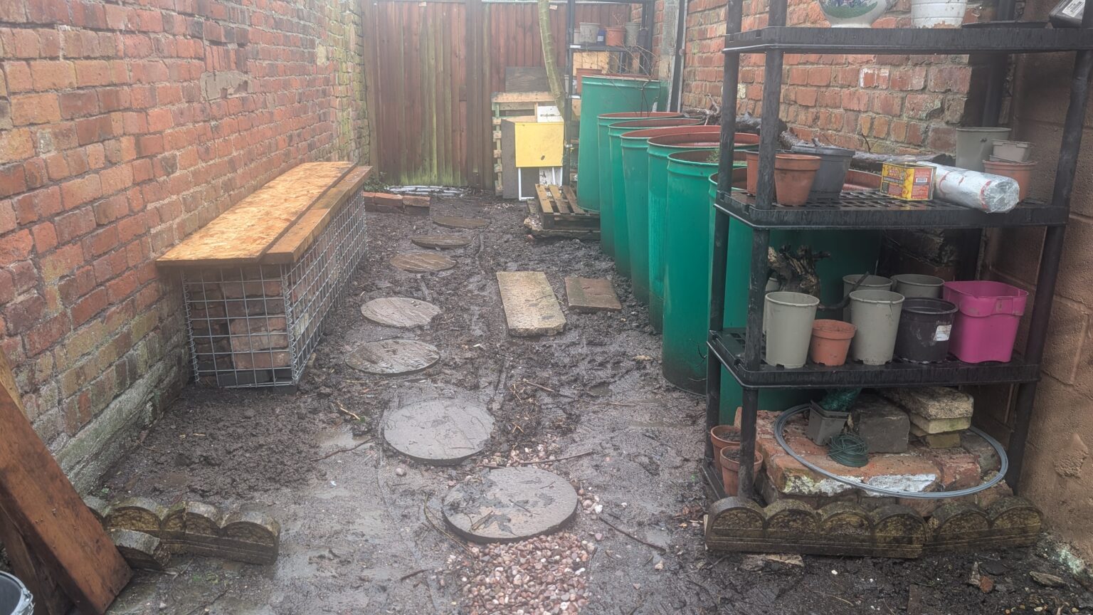 At the far end of the alley, we planned to create an allotment area, material and budget permitting. It was full of old building rubble, paddling pools, overgrowth, a discarded green bin and a buried pet.
