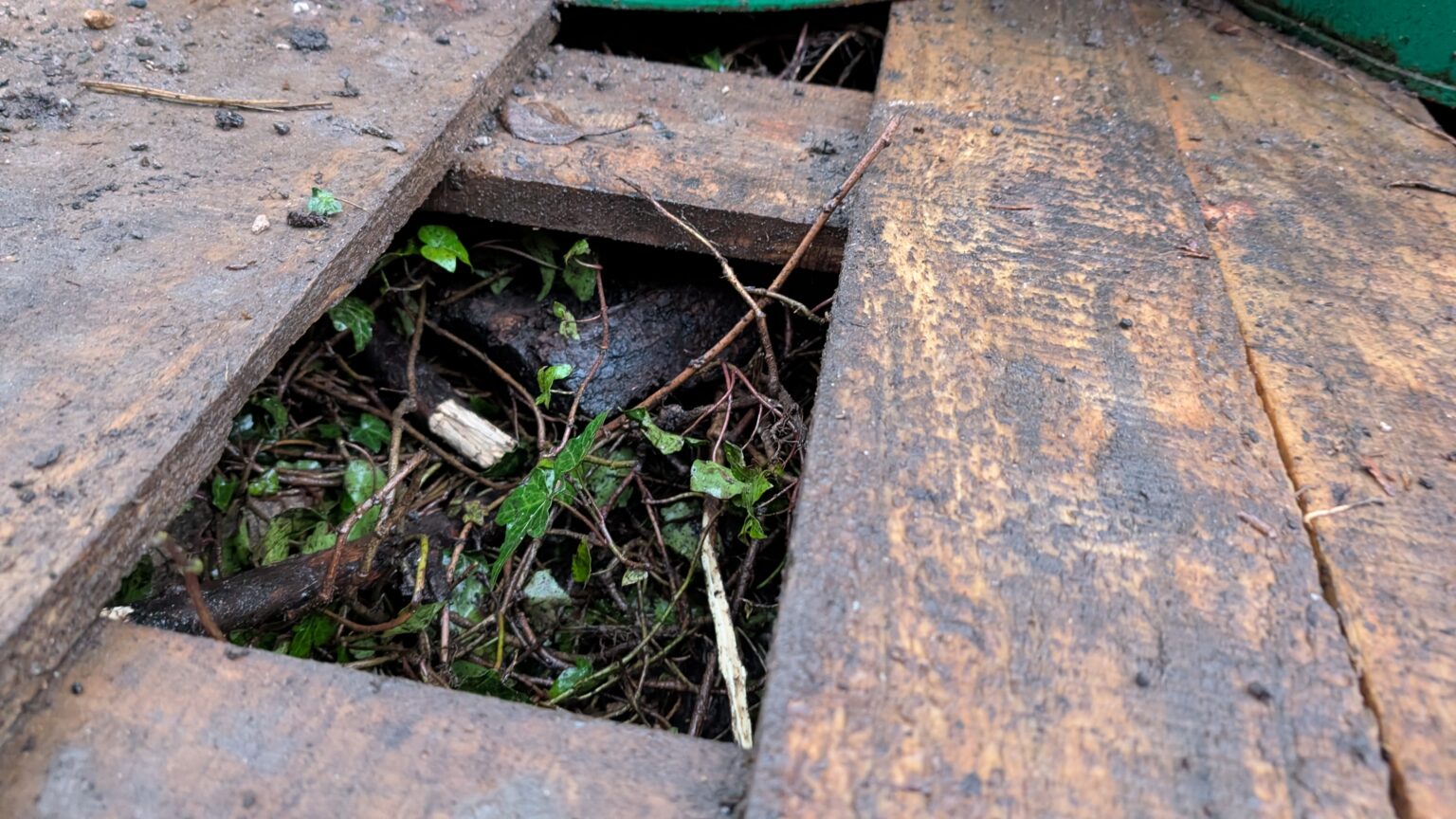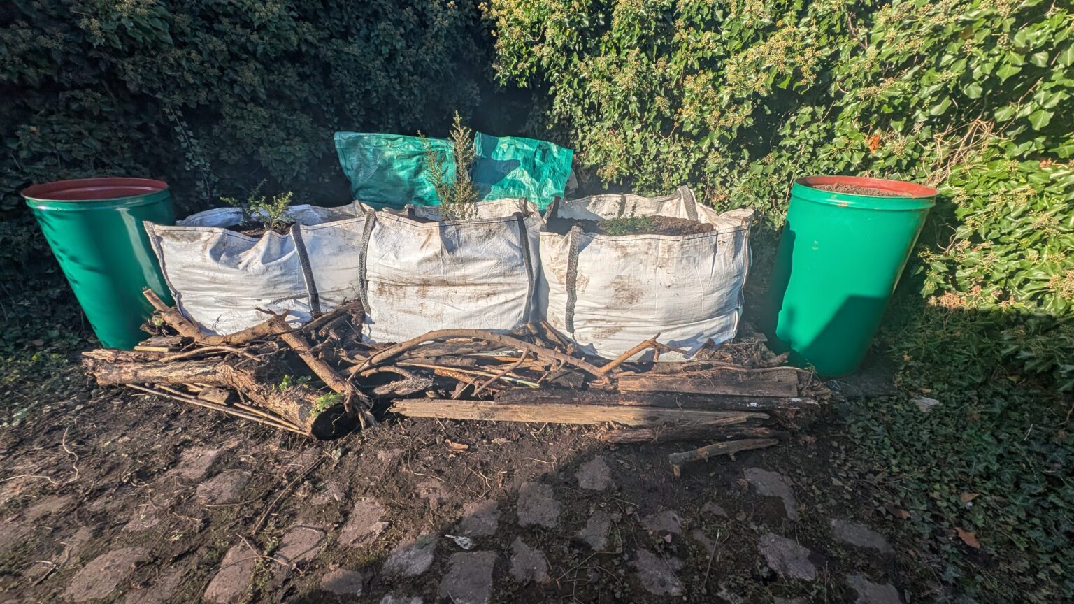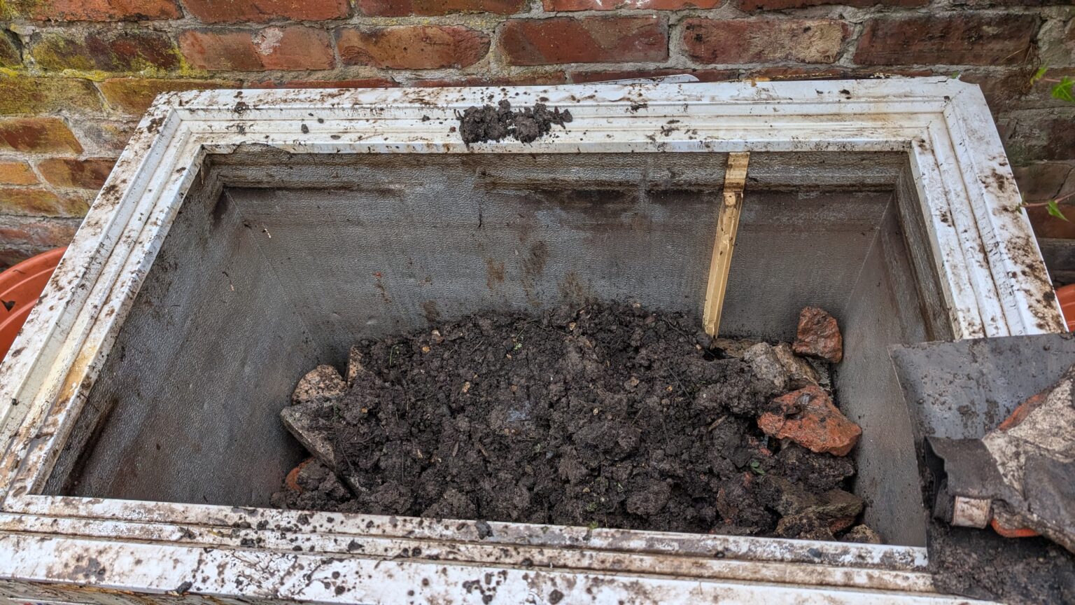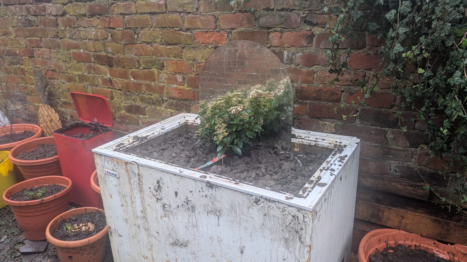 At the far end of the alley, we planned to create an allotment area, material and budget permitting. It was full of old building rubble, paddling pools, overgrowth, a discarded green bin and a buried pet.