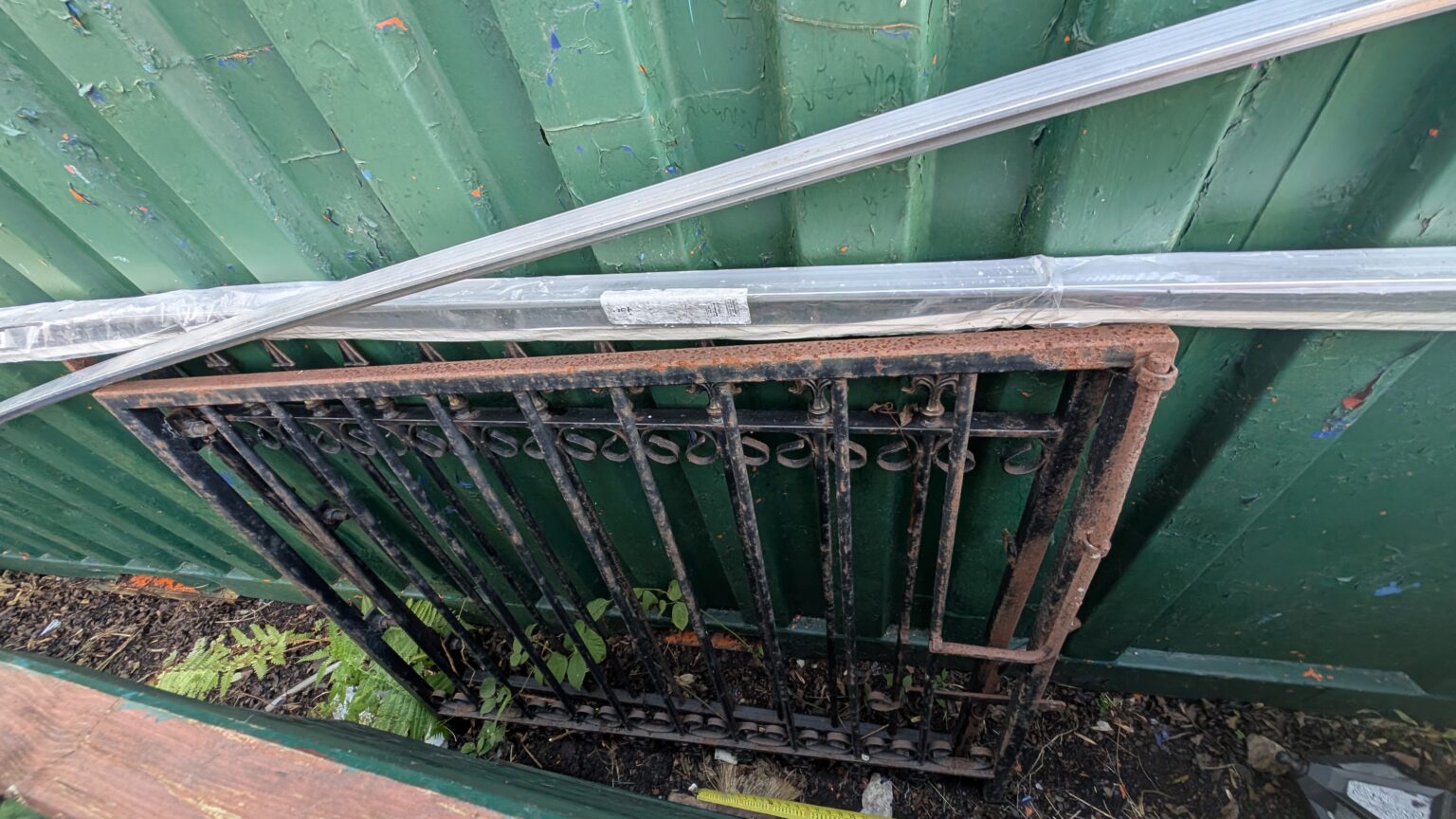 Our local pub had some iron gates tucked away in their garden, which were the perfect fit for our alleyway entrance. They agreed to sell them for £100 and threw in some pots and chairs too. They were very heavy so it was a bit of a struggle getting them back to the alley.
