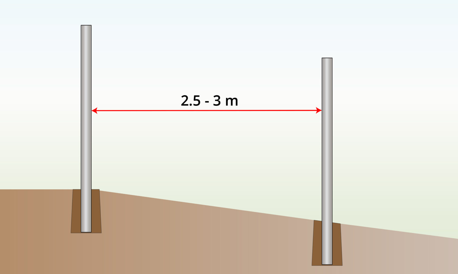 - Determine the placement of the posts, spacing them 2.5–3 meters apart, and adjust the distance to accommodate variations in the incline.