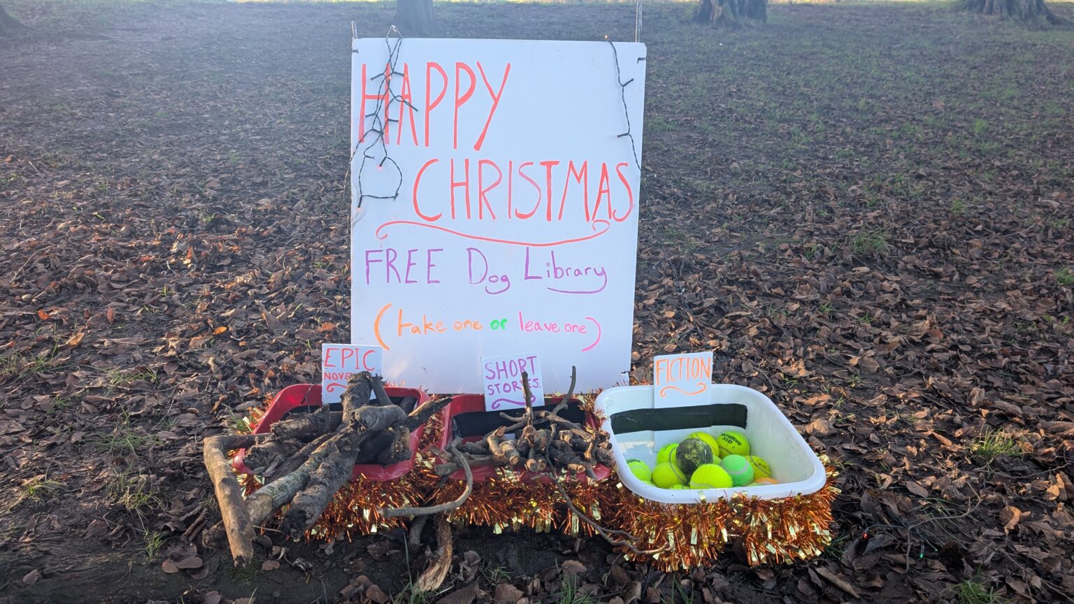 At 4 a.m., John Summers, founder of Wire Fence and a local resident, installed the Dog Library at the entrance to Levenshulme’s popular Cringle Park. The library offers a selection of sticks, tennis balls, and throwing toys for dogs to take and enjoy, with the option for owners to leave something behind for the next dog.